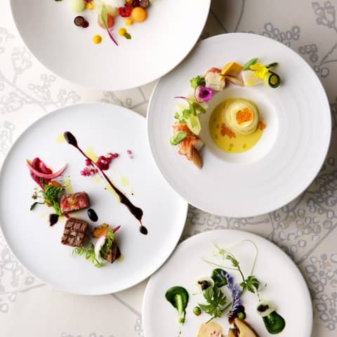 食材は地産地消にこだわり、地元で採れた新鮮素材をふんだんに使用。馴染みのある食材が熟練のシェフにより彩り豊かに姿を変え、驚きと感動を提供します。オープンキッチンだからダイレクトに届く、ライブ感に溢れた音や香りの演出。見て楽しい、食べて美味しいなど、五感を喜ばせる魅力がたっぷり。また箸でも食べられるので、幅広い年齢層のゲストから好評です。
